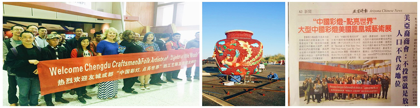 (菲尼克斯當(dāng)?shù)厝A僑及美國友人歡迎燈貿(mào)集團(tuán)工作人員的到來) (彩燈燈組現(xiàn)場(chǎng)安裝工作正在進(jìn)行) (當(dāng)?shù)孛襟w對(duì)本次燈展進(jìn)行相關(guān)報(bào)道)