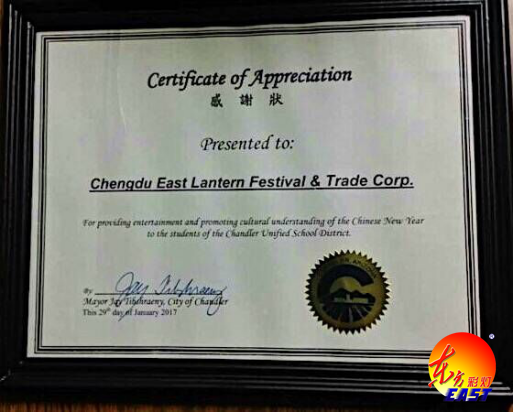 自貢燈貿(mào)集團(tuán)股份有限公司、四川藝思特彩燈文化傳播有限公司主辦的“2016世界之光——彩燈嘉年華”跨年燈展,于當(dāng)?shù)貢r間2017年1月29日在美國亞利桑那州首府菲尼克斯(鳳凰城)順利落下帷幕。成都市委副秘書長、印第安納州州長 Burns Mike及當(dāng)?shù)卣獑T出席閉幕式并代表州政府對本次燈展頒發(fā)特令嘉獎。