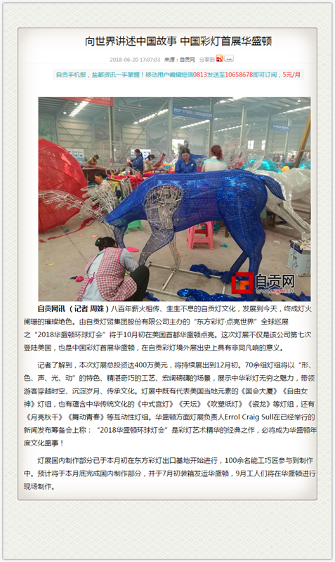 “2018華盛頓環(huán)球燈會(huì)”是東方彩燈第七次登陸美國(guó),也是中國(guó)彩燈首展美國(guó)政治中心——華盛頓,受到各界廣泛關(guān)注。近日,《四川日?qǐng)?bào)》、《自貢日?qǐng)?bào)》等多家官方媒體對(duì)本次燈展做了專題報(bào)道。