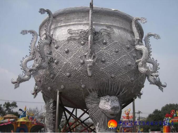 東方彩燈精心設(shè)計(jì)制作的“九龍鼎”燈組采用景德鎮(zhèn)青花玲瓏瓷具杯、羹、匙、盅、盤、碟、碗等近30萬(wàn)件手工捆扎而成,主體為鋼結(jié)構(gòu);鼎高和直徑均為18米,最大處直徑26米,總重近100噸。