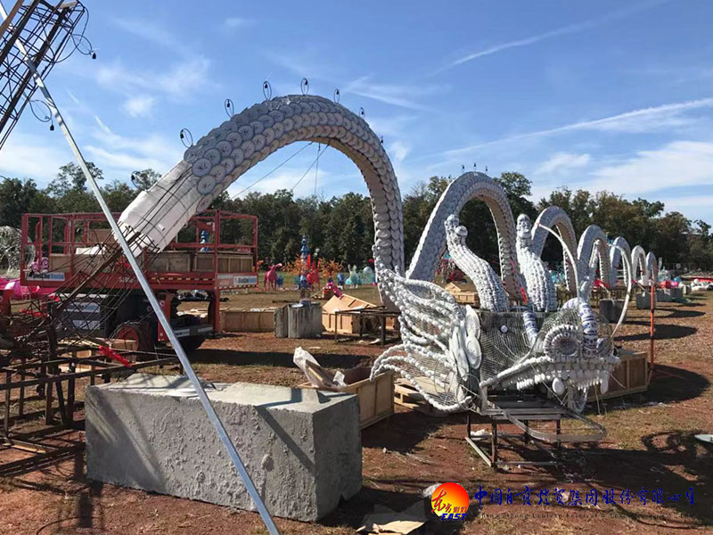 美的創(chuàng)造離不開現(xiàn)代科技手段,“2018年華盛頓環(huán)球燈會”運(yùn)用有:LED幻彩變光技術(shù),使燈組物理空間上的呈現(xiàn)更加動感迷人;光束燈技術(shù),美輪美奐的五彩射光,伴隨著音樂的變化此起彼伏,現(xiàn)場觀看最能切身體會魅力四射的藝術(shù)效果;吹塑紙技術(shù)的創(chuàng)新,營造出光鮮亮麗、惟妙惟肖的事物造型,讓人嘆為觀止;特殊材質(zhì)飲料瓶這一精湛工藝,在環(huán)保的同時又呼吁人們愛護(hù)自熱環(huán)境;仿真技術(shù)的成熟應(yīng)用,又還原了遠(yuǎn)古時代的恐龍世界。