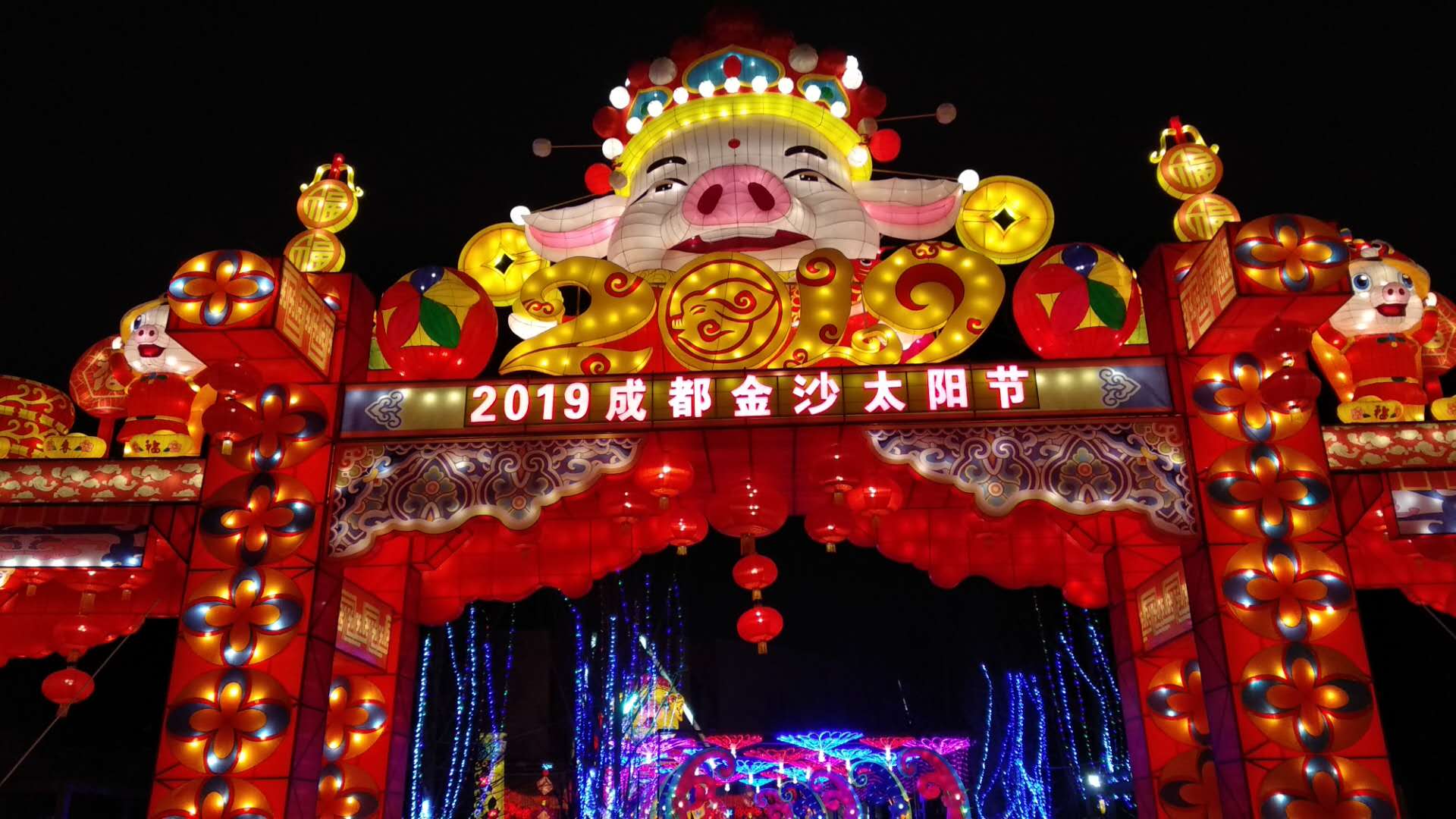 金沙太陽(yáng)節(jié)史上最大的立體生肖造型,卡通豬組合燈組“金豬賜?!?,向游客傳遞豬年的美好祝福?!叭朔晔⑹狼闊o(wú)限,豬拱華門(mén)歲有余”,歡樂(lè)祥瑞的金豬將福澤灑滿(mǎn)天府大地。