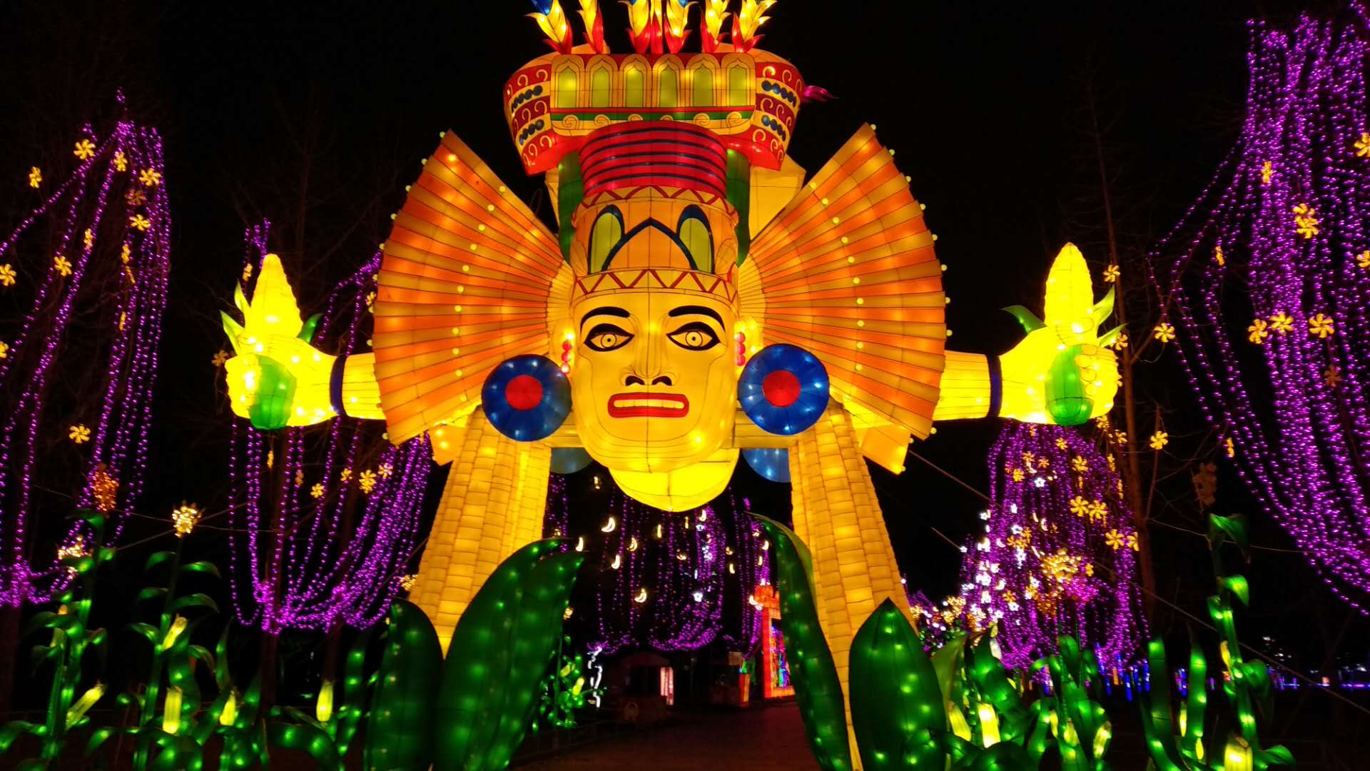 “瑪雅之光”是本屆太陽(yáng)節(jié)燈組的又一大亮點(diǎn)。首次運(yùn)用彩燈的手法,再現(xiàn)神秘的瑪雅世界,引領(lǐng)游人穿越時(shí)空,欣賞這一古老文明留贈(zèng)現(xiàn)世之美。作為中美洲熱帶叢林中悄然萌芽卻又戛然而止的神秘文明,瑪雅的象形文字、宇宙觀念、創(chuàng)世傳說(shuō)、神靈崇拜及其精神信仰都成為燈組著力表現(xiàn)的內(nèi)容。