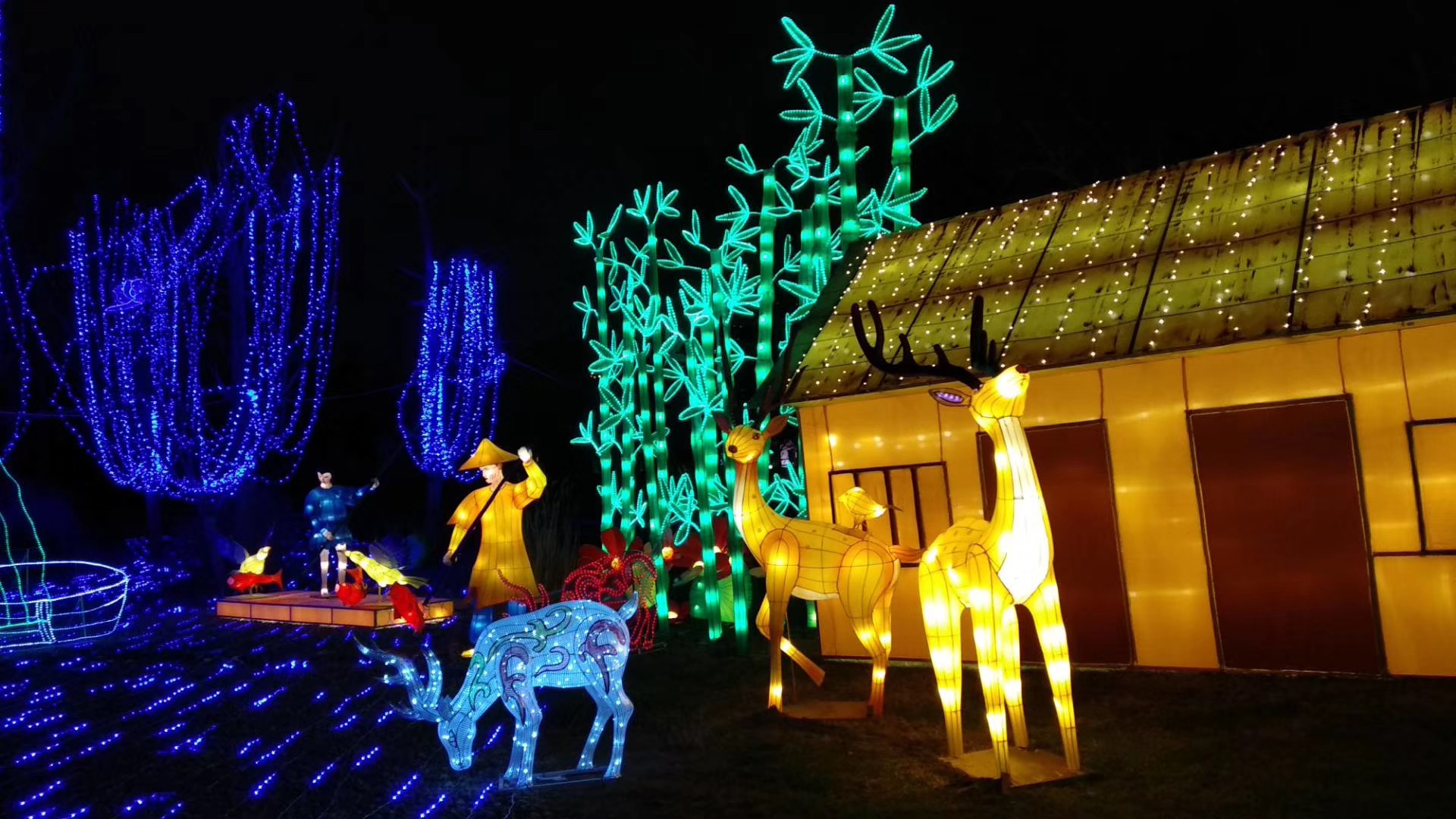 遺跡館外的“古蜀家園”也是本屆太陽(yáng)節(jié)規(guī)模較大的燈組之一。竹林、小屋、麋鹿等景觀再現(xiàn)古蜀國(guó)的自然生態(tài)環(huán)境。彩燈刻畫(huà)出一組一組栩栩如生的景色,再現(xiàn)古蜀生活時(shí)的盛大場(chǎng)景。