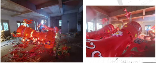 現(xiàn)場大多數(shù)的花燈還在按流程趕制中,也有一些已成型了。已經(jīng)制作好的打鼓你能看出是哪一個花燈造型的嗎?