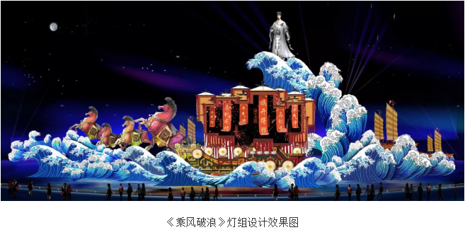 西區(qū)湖面上,長65米,高22米的主題燈組“乘風(fēng)破浪”是本屆廟會中的“巨無霸”,利用現(xiàn)代燈光技術(shù)以獨特的藝術(shù)手法展現(xiàn)了三國時期的著名戰(zhàn)役——赤壁之戰(zhàn)。一幕精彩的三國故事圖卷將在波光粼粼的湖面上徐徐鋪展。