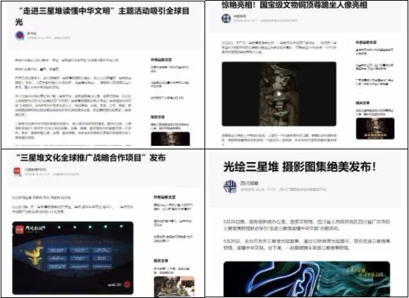 截至5月29日10點(diǎn),各大主流媒體紛紛推出《光繪三星堆 攝影圖集絕美發(fā)布!》《揭開古蜀國(guó)神秘面紗 走進(jìn)三星堆體驗(yàn)博物館奇妙夜》《新出土千余件重要文物后 三星堆吸引中外媒體讀懂中華文明》《三星堆國(guó)寶文物銅頂尊跪坐人像亮相!》《“三星堆文化全球推廣戰(zhàn)略合作”9大項(xiàng)目正式發(fā)布》等新聞報(bào)道。