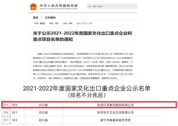 近日,商務(wù)部、中宣部、財(cái)政部、文化和旅游部、國(guó)家廣電總局五部委聯(lián)合公示《2021—2022年度國(guó)家文化出口重點(diǎn)企業(yè)和重點(diǎn)項(xiàng)目名單》,自貢燈貿(mào)集團(tuán)股份有限公司再次入錄“2021-2022年度國(guó)家文化出口重點(diǎn)企業(yè)”公示名目。這是自貢燈貿(mào)集團(tuán)股份有限公司自2007年以來(lái),連續(xù)第八次榮獲此殊榮,也是全國(guó)彩燈行業(yè)唯一連續(xù)八屆十六年獲此殊榮的服貿(mào)類企業(yè)。