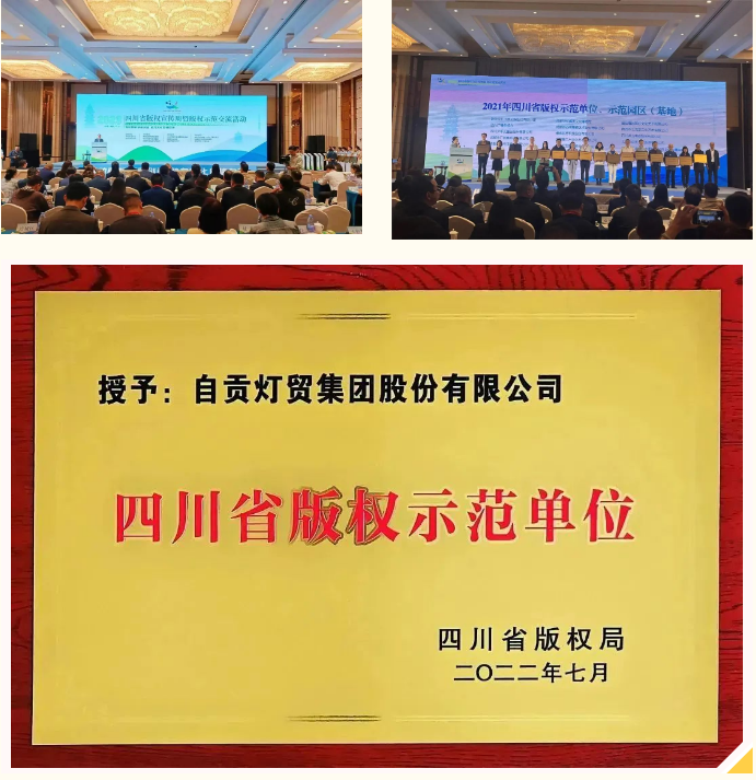 在第23個世界知識產(chǎn)權(quán)日來臨之際,由中國版權(quán)協(xié)會、四川省委宣傳部版權(quán)局主辦,綿陽市委宣傳部承辦的“四川省2023版權(quán)宣傳周暨版權(quán)示范交流活動”于2023年4月25日在綿陽舉行,活動以“推動版權(quán)創(chuàng)新創(chuàng)造 助力文化自信自強”為主題,以線上線下聯(lián)動方式同步推出?;顒赢?dāng)天,省版權(quán)局為2021至2022國家級、省級版權(quán)示范單位和示范園區(qū)(基地)授牌。自貢燈貿(mào)集團股份有限公司參加了活動,并獲頒“四川省版權(quán)示范單位”榮譽稱號。